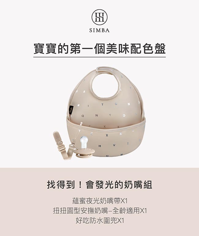 內容物: 扭扭圓型安撫奶嘴*1 +蘊蜜夜光奶嘴帶*1 + 好吃防水圍兜*1