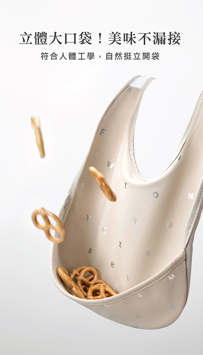 •立體大口袋,自然挺立開袋,落食不漏接。