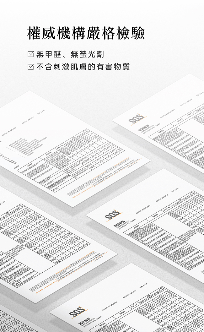•經權威機構嚴格檢驗,無甲醛、無螢光劑,不含刺激肌膚的有害物質。