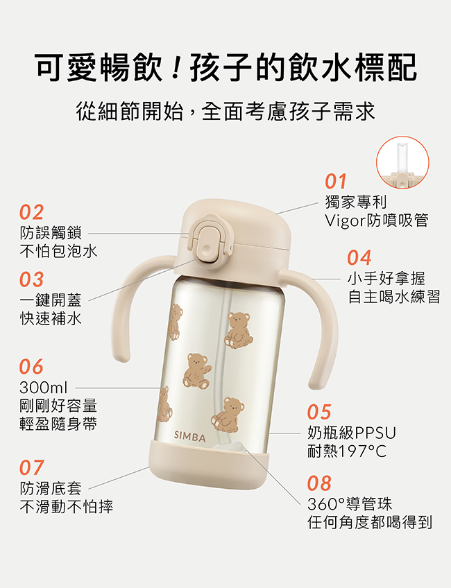 •獨家專利Vigor防噴吸管,溫水不噴,倒放不漏。