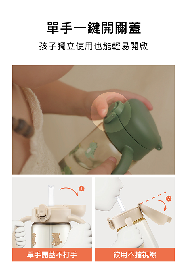 扣環向下即解鎖,按壓彈蓋按鍵開啟上蓋,雙手握住把手以吸嘴吸飲,飲用後請將扣環向上鎖定。請搭配軟質刷具清洗並置於陰涼乾燥處存放。