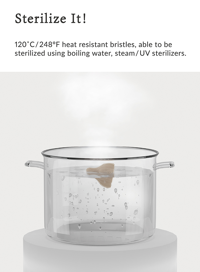 • Bristles are heat resistant up to 120℃, can be boiled in water, steam dried, and sterilized with ultraviolet light.