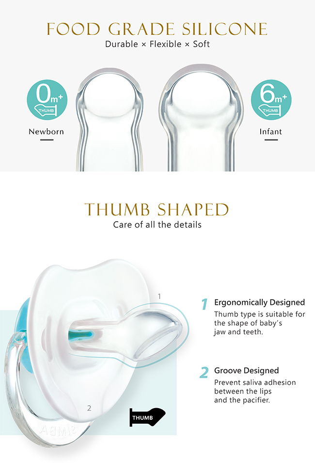• Thumb-shape design that fits the baby's lip and teeth construction, will not cause shape change of the baby's mouth after prolonged usage. Allows for normal development in gum and teeth positioning.