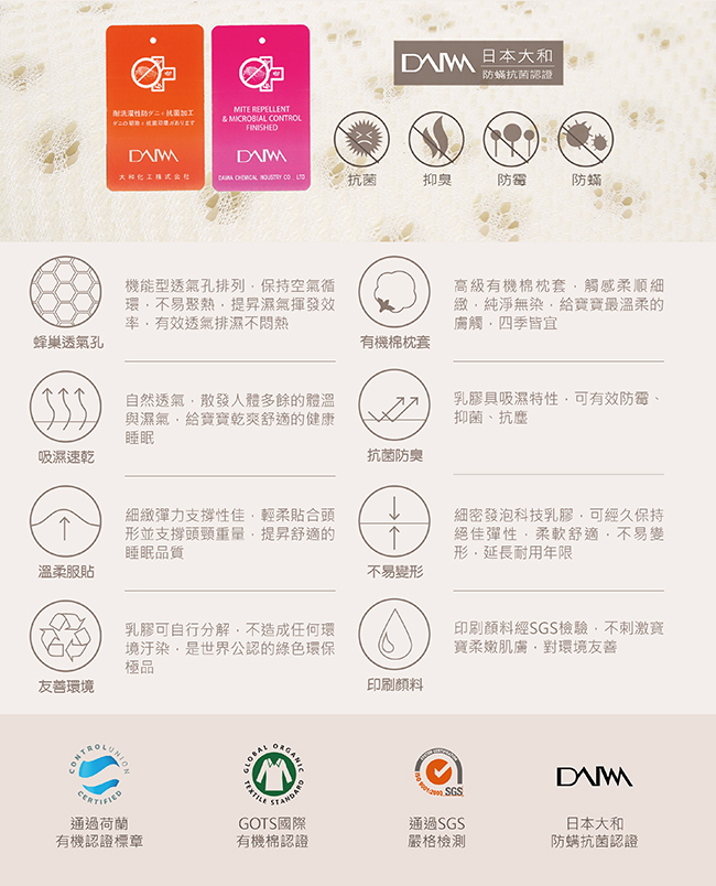 •通過「荷蘭國際有機認證標章」,無螢光劑、甲醛及環境賀爾蒙。