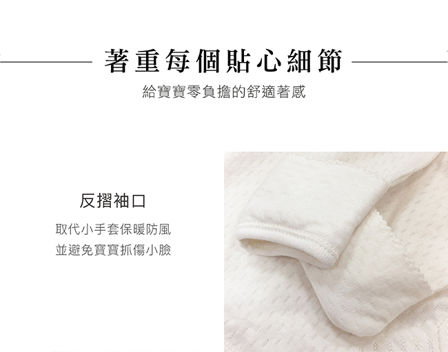 柔軟細緻,反袖護手設計保護寶寶雙手。