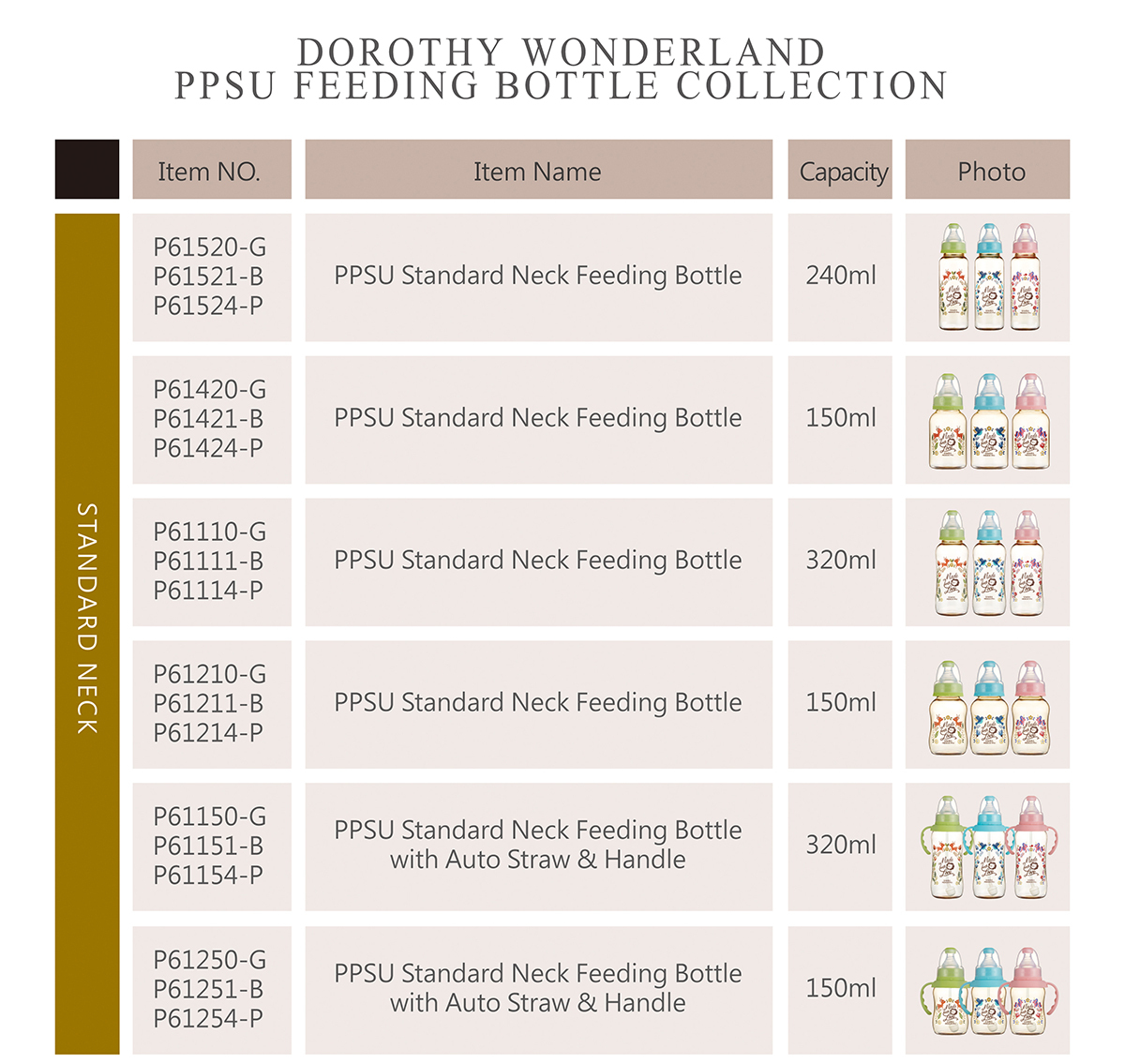 Dorothy Wonderland PPSU Feeding Bottle Collection - Made ofworld-class FDA approved food grade material SOLVAY. Bottle steam sterilizationresistance of more than 1,000 times.