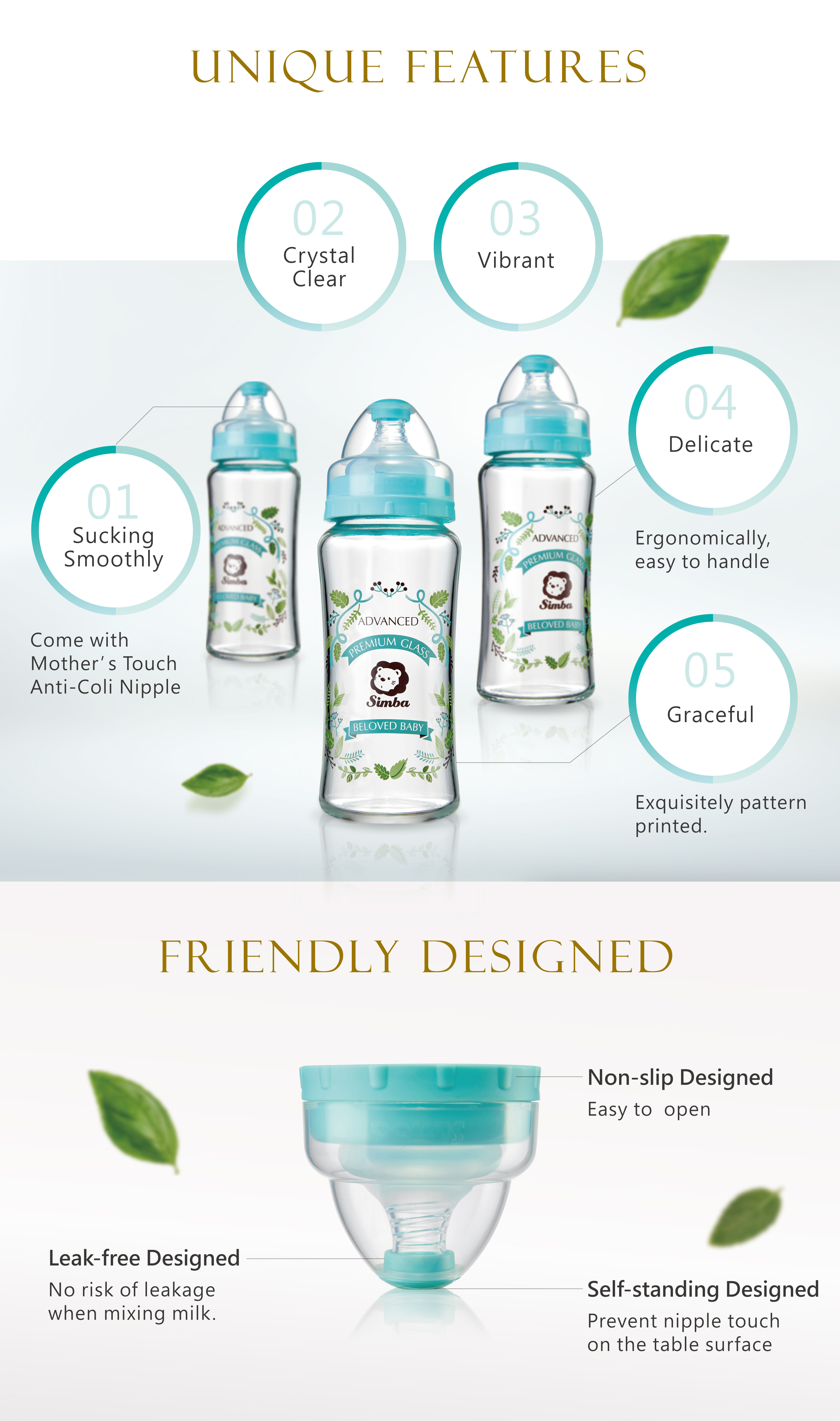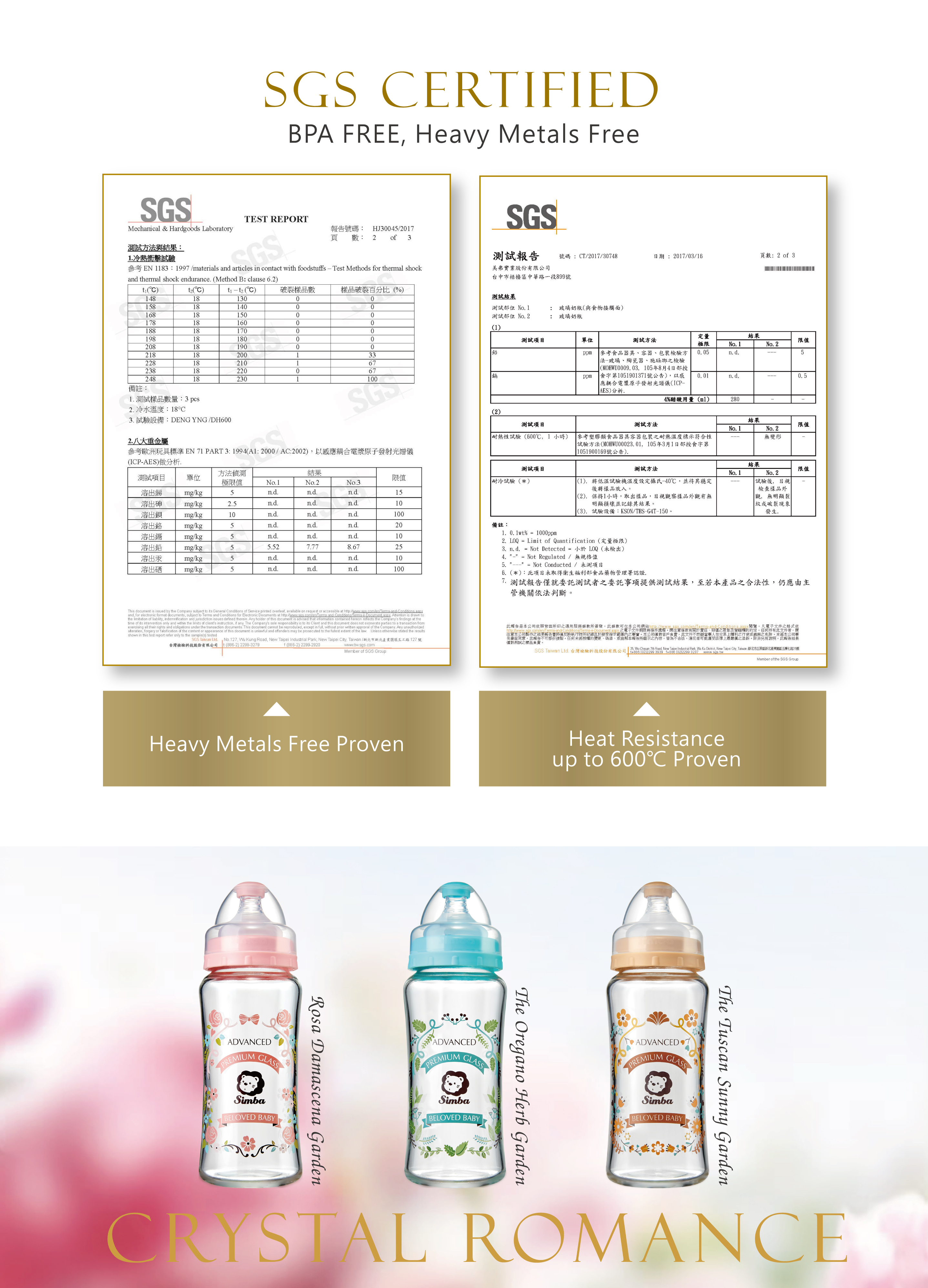 The first award-winning baby bottle in Taiwan Excellence Awards history - Crystal Romance Glass Feeding Bottle Collection - Select 600℃ heat resistant high quality glass, qualified by internationally recognized laboratories, complying with CNS (Taiwan), EN-14350(EU) and FDA (US) standards. Acid and alkali resistant, thermal shock resistance of over 150℃. The botanical & floral design bringing feelings of vitality, a lively reflection of the baby's progress.