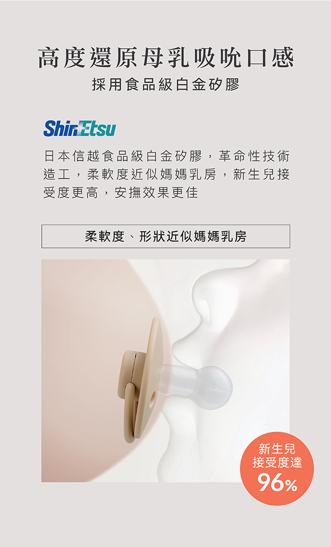 •材質嚴選日本信越食品級白金矽膠,新生兒接受度高達96%。
