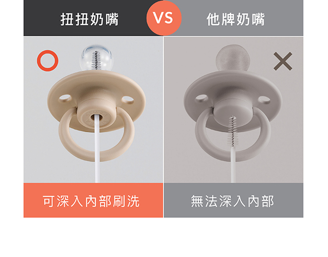 •市售適用性最廣,99.9%安撫奶嘴、固齒器皆適用。