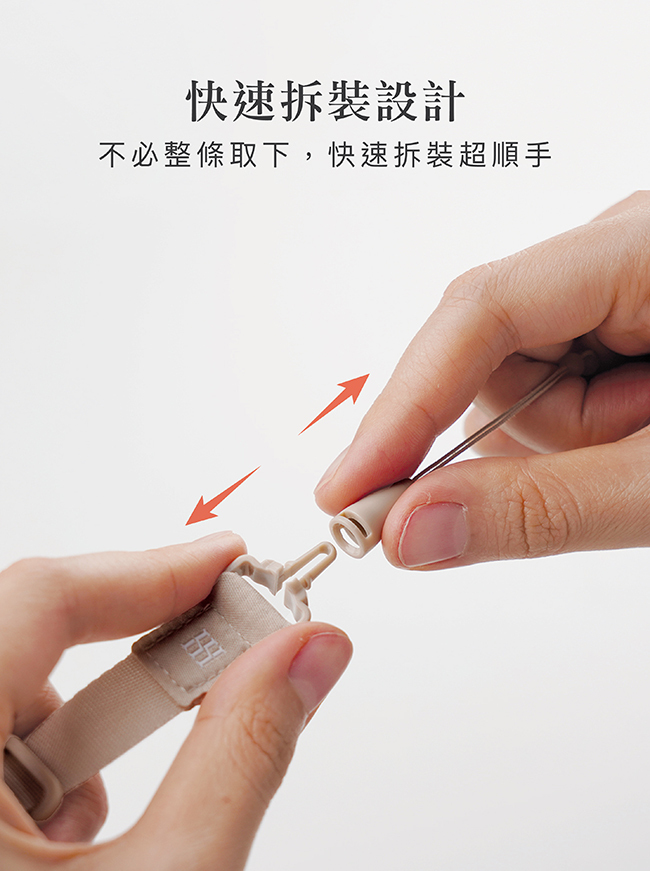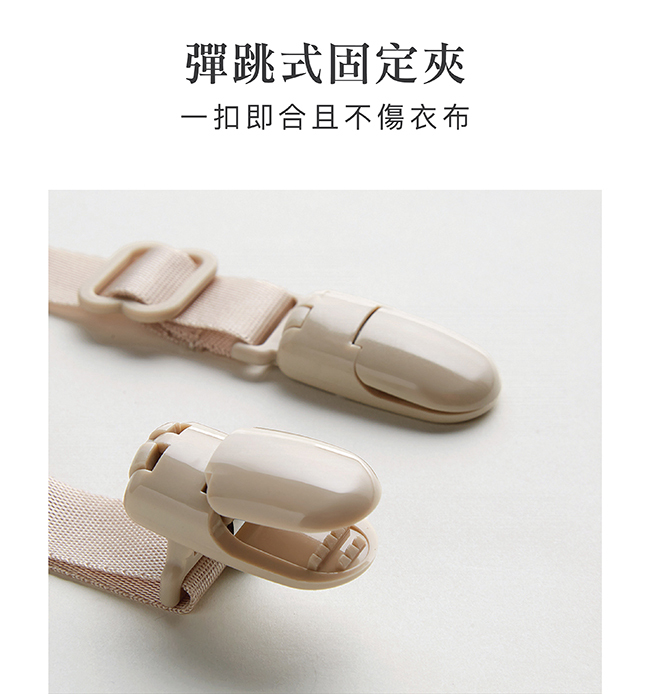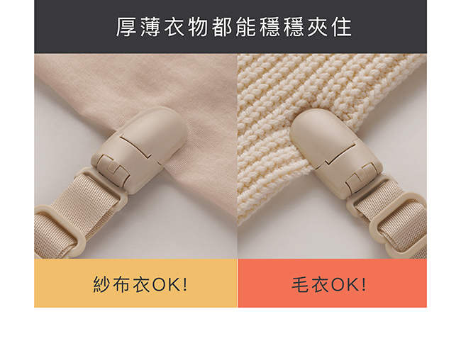 •彈跳式固定夾,一扣即合且不傷衣布,厚薄衣物都能穩穩夾住。