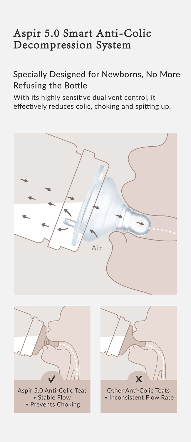 •Aspir 5.0 Smart Anti-Colic Decompression System - Anti-choking, anti-dripping, anti-colic and easy burping.