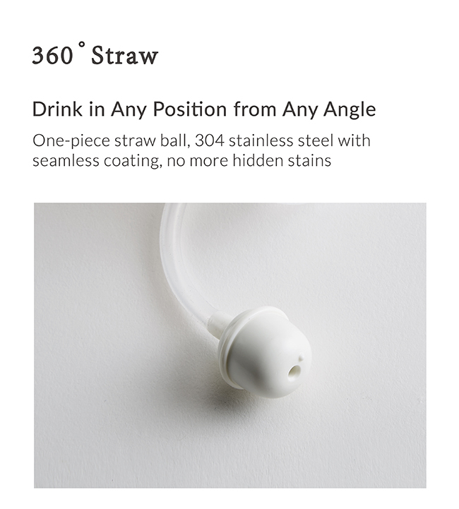 •360° Straw, drink in any position from any angle. One-piece straw ball, 304 stainless steel with seamless coating, no more hidden stains.