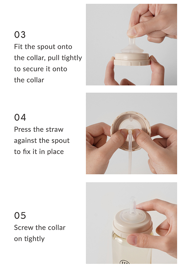 03 Fit the spout onto the collar, pull tightly to secure it onto the collar