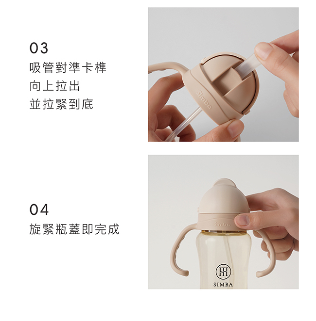 組裝吸管配件,將吸管對準卡榫向上拉出,聽到啵聲即可,旋緊瓶蓋即完成。