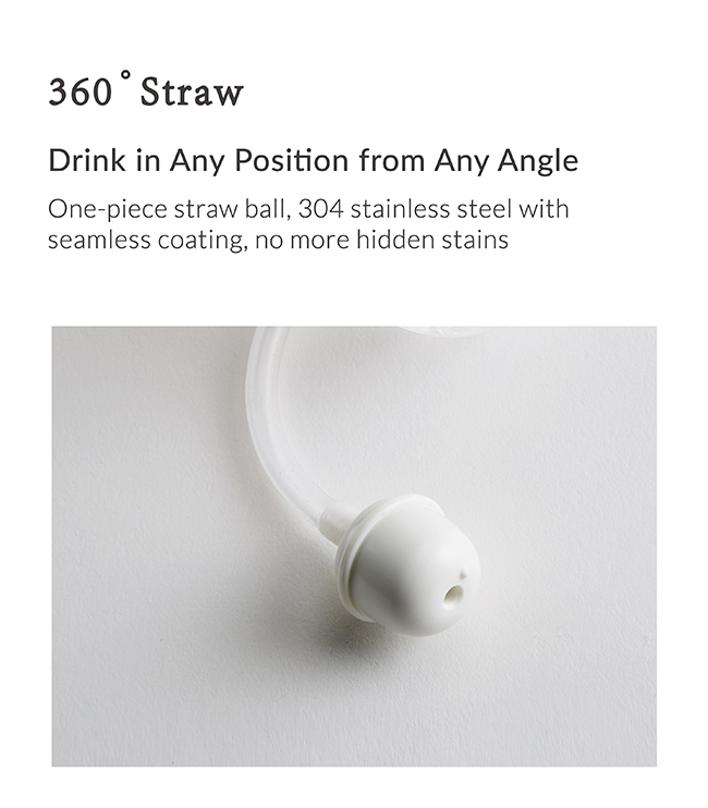 •360° Straw, drink in any position from any angle. One-piece straw ball, 304 stainless steel with seamless coating, no more hidden stains.