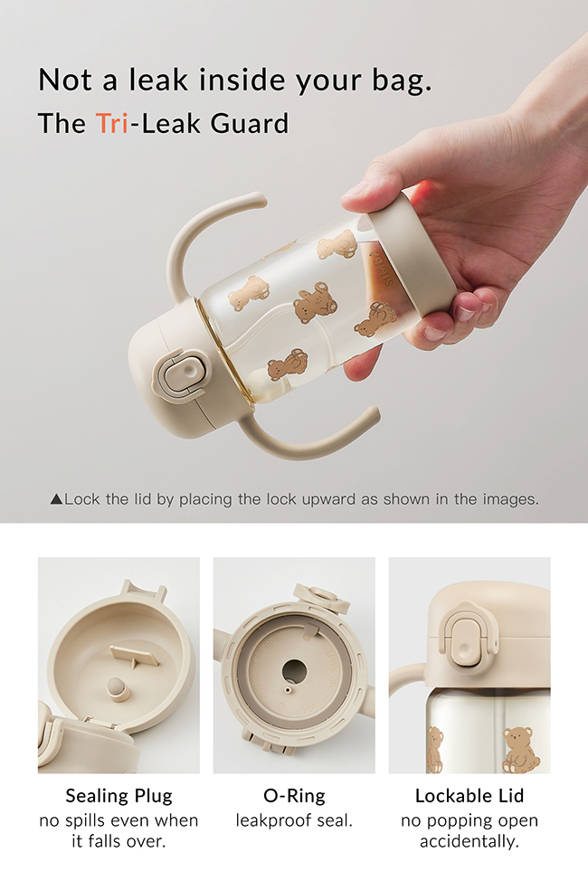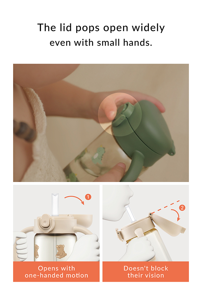 扣環向下即解鎖,按壓彈蓋按鍵開啟上蓋,雙手握住把手以吸嘴吸飲,飲用後請將扣環向上鎖定。請搭配軟質刷具清洗並置於陰涼乾燥處存放。