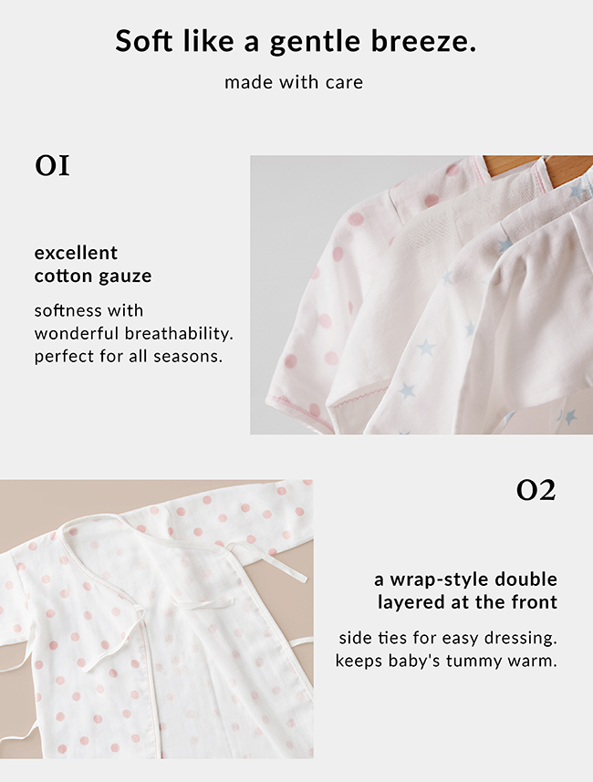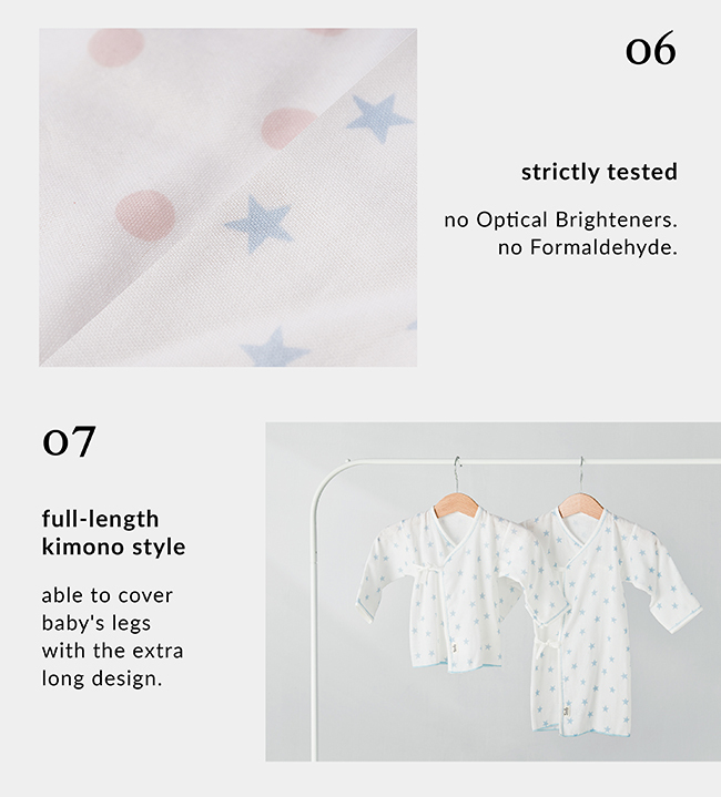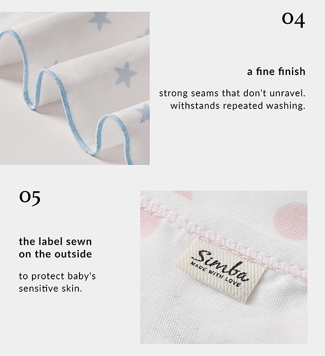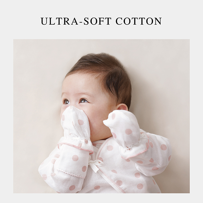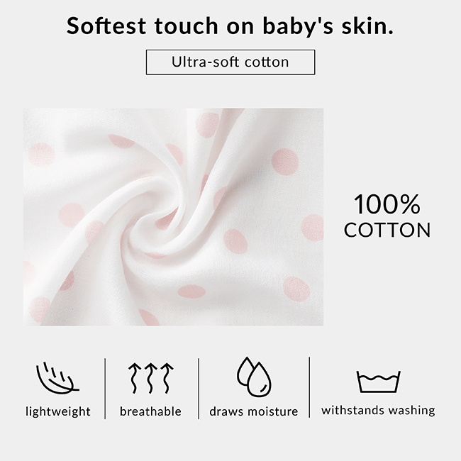 The softest touch on baby's skin. Ultra-soft cotton gauze, snuggly and cuddly. No Optical Brighteners, no Formaldehyde, none of those nasty chemicals. Doesn't irritate baby's delicate skin.