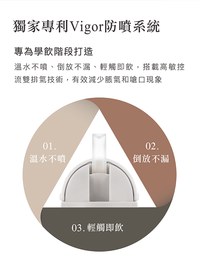 •新革命!獨家專利Vigor防噴系統,溫水不噴、倒置不漏。