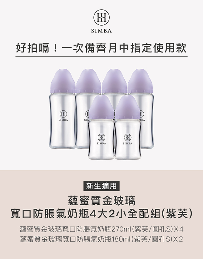 【新品上市】小獅王辛巴 新生專用-蘊蜜質金玻璃寬口防脹氣奶瓶4大2小全配組 (紫芙)