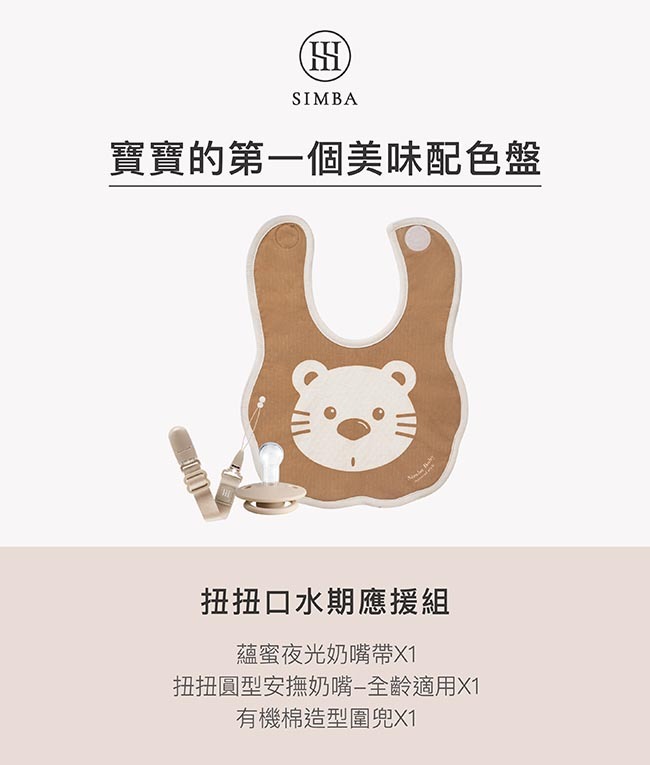 內容物: 扭扭圓型安撫奶嘴*1 +蘊蜜夜光奶嘴帶*1 + 有機棉造型圍兜*1