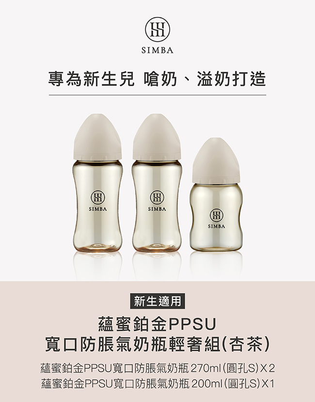 小獅王辛巴 新生適用-270ml/9oz+200ml/7oz 蘊蜜鉑金PPSU寬口防脹氣奶瓶輕奢組(2中1小)