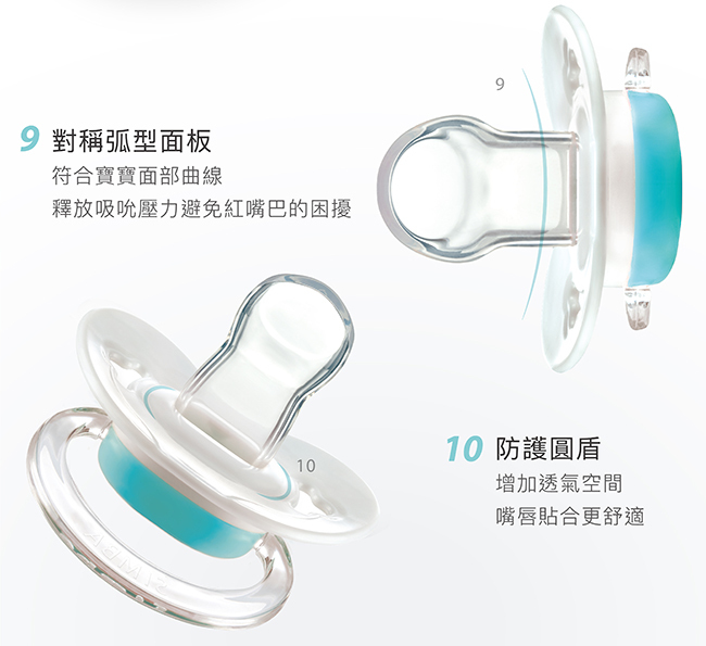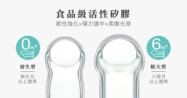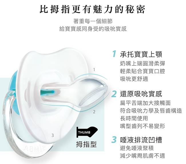 2.拇指型特殊造型設計,符合嬰兒唇齒構造,長時間吸吮使寶寶嘴型不變形,讓牙齦與齒列正常發展。