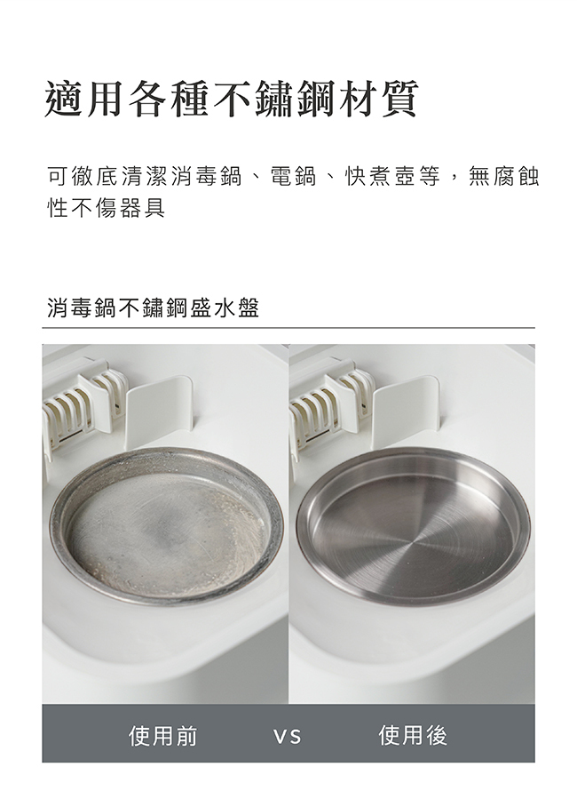 •適用各種不銹鋼材質,無腐蝕性不傷器具。