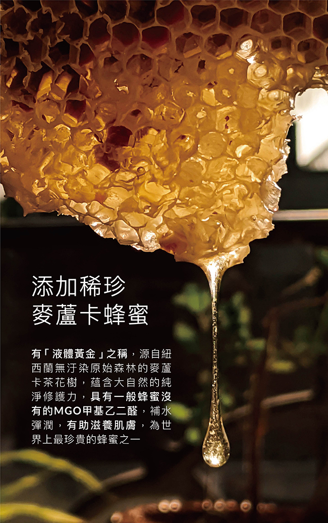 •添加稀珍麥盧卡蜂蜜,具有一般蜂蜜沒有的MGO甲基乙二醛,補水彈潤,有助滋養肌膚。