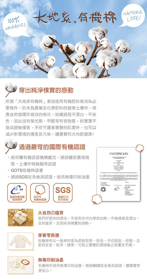 •通過「荷蘭國際有機認證標章」,無螢光劑、甲醛及環境賀爾蒙。