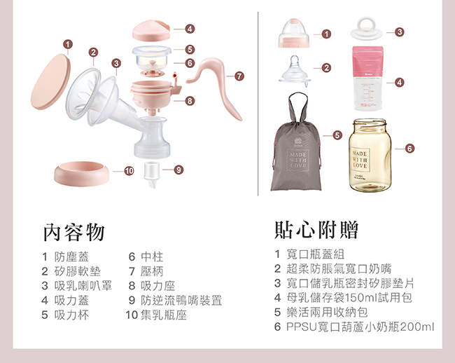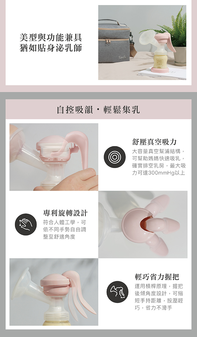 1.可單手操作─運用槓桿原理,操作簡單,穩定吸力,能輕鬆吸出乳汁、減輕脹奶的不適感。