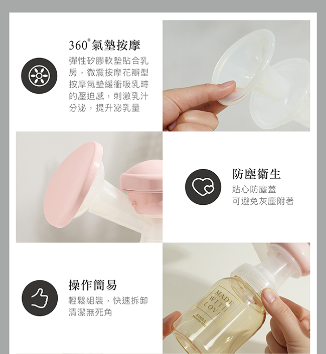 4.氣墊按摩─彈性吸乳矽膠軟墊溫柔貼合乳房,花瓣型按摩顆粒氣墊設計,不僅緩衝吸乳時的壓迫感更可按摩乳房刺激乳汁分泌。