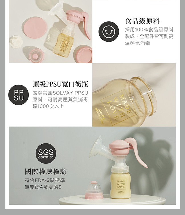 防塵蓋/吸乳喇叭罩/吸力蓋/中柱/壓柄/吸力座/集乳瓶座/寬口瓶蓋組:聚丙烯 PP (-20℃~ 100℃) 矽膠軟墊/吸力杯/防逆流鴨嘴裝置/寬口儲乳瓶密封矽膠墊片/矽膠管:矽膠 Silicone (-20℃~ 120℃) PPSU寬口葫蘆小奶瓶200ml:聚亞苯基碸 (-20℃~ 197℃) 超柔防脹氣奶嘴:矽膠 Silicone (-40℃~ 150℃)