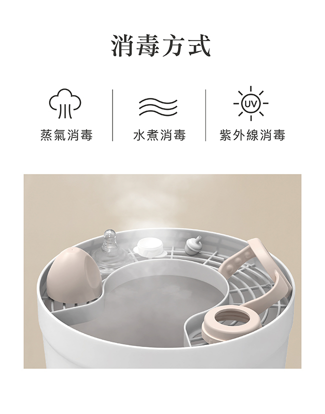 •配件全拆洗清潔最徹底,可蒸氣、水煮、紫外線消毒。