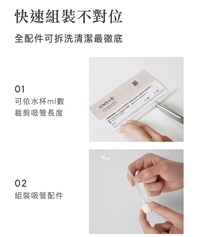 依說明書裁剪吸管長度,組裝吸管配件後,將吸管穿過中蓋並拉緊密合,吸嘴與吸管相互套緊到底,旋緊瓶蓋即完成。