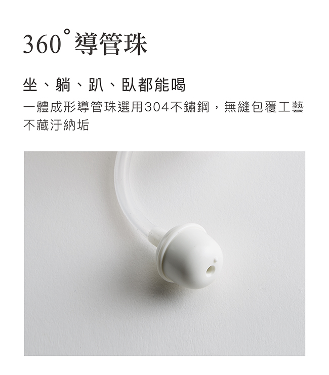 •360˚導管珠,坐、躺、趴、臥都能喝,導管珠無縫包覆工藝不藏汙納垢。