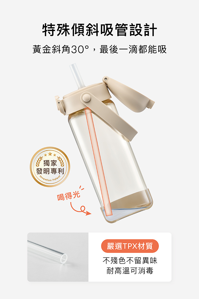 •獨家發明專利傾斜吸管設計,最後一滴都能吸。